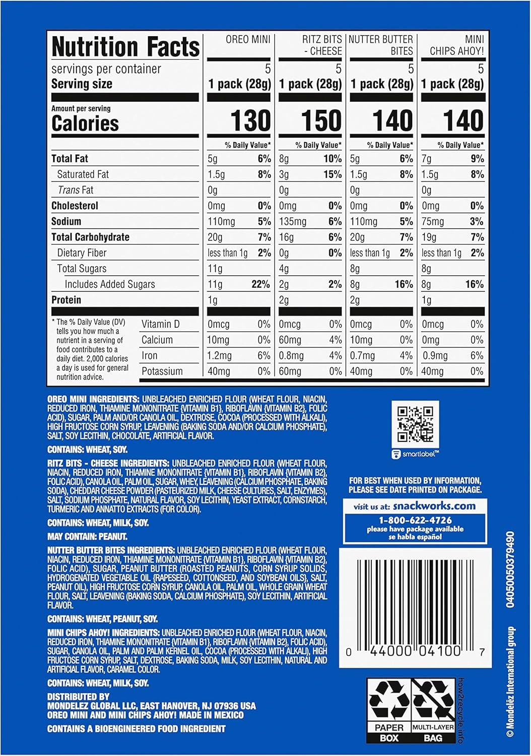 • One Nabisco Classic Mix Variety Pack with 20 snack packs, including OREO Mini, CHIPS AHOY! Mini, Nutter Butter Bites, RITZ Bits Cheese (packaging may vary)